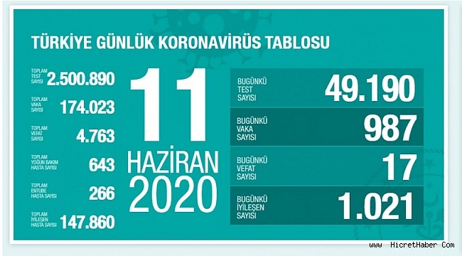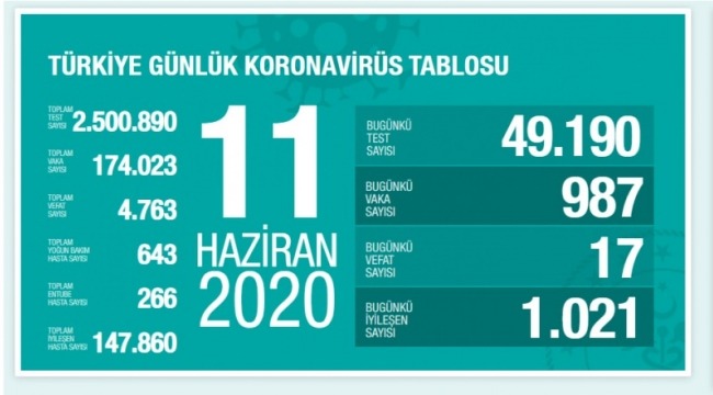 Sağlık Bakanlığı tarafından 11 Haziran koronavirüs tablosu, vaka, test, vefat sayısı ve son durum açıklandı. Türkiye'de son 24 saatte 987 kişiye Kovid-19 tanısı kondu, 17 kişi hayatını kaybetti, toplam vaka sayısı 174 bin 23, can kaybı 4 bin 763 oldu. Bakan Koca “Virüsün etkisi azaldı” yanılgısı ile tedbirleri terk etmeyin." uyarısında bulundu.
