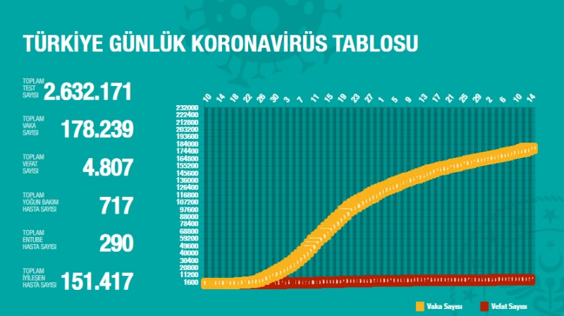 Sağlık Bakanlığından yapılan açıklamaya göre, son 24 saatte 15 kişi korona virüsten hayatını kaybetti, toplam can kaybı ise 4 bin 807'e yükseldi. Bugün toplam 45 bin 176 test yapılırken, bin 562 yeni vaka tanısı konuldu, toplam vaka sayısı ise 178 bin 236 oldu.
