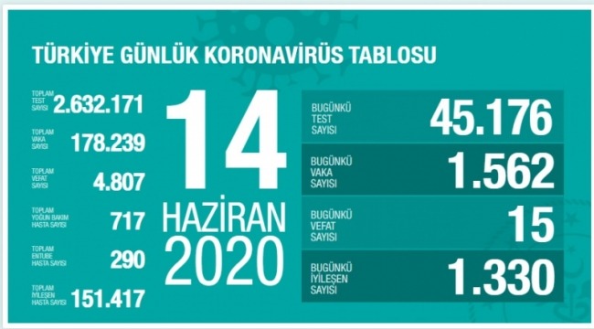 Sağlık Bakanı Fahrettin Koca 14 Haziran koronavirüs tablosuna ilişkin yaptığı açıklamada, ''İyileşen hasta sayımız yeni vaka sayısının altına düştü. Yoğun bakıma ve solunum cihazına ihtiyaç artıyor: Hedeften uzaklaşıyoruz. En zayıf noktamız, TEDBİRSİZ iyimserlik. TEDBİRLİ İYİMSER olalım. Kontrollü Sosyal Hayat dönemine yarın tam olarak geçelim. '' ifadelerini kullandı.