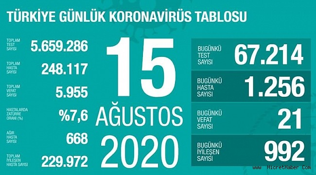 Sağlık Bakanı Fahrettin Koca 15 Ağustos koronavirüs tablsouna ilişkin sosyal medya hesabından yaptığı açıklamada, "Son 45 günün en yüksek pozitif tanı -yeni hasta- sayısına ulaştık. Kritik göstergemiz olan Ağır Hasta sayısı, genellikle risk grubunda olup hastalığa yakalananlar ile artıyor. Yeni hasta sayısını, ağır hasta sayısını, can kayıplarını birlikte azaltalım" ifadelerini kullandı.