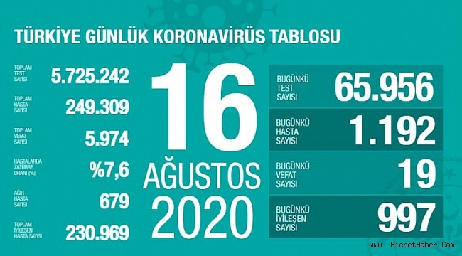 Sağlık Bakanı Fahrettin Koca, 16 Ağustos koronavirüs tablosuna ilişkin yaptığı açıklamada, ''Yeni tanı sayımız dünkünden daha az. Şu ana kadarki toplam vaka sayımızdan 12.366 KİŞİ halen aktif hasta: Yani, virüsü yayma potansiyeline sahip. Bunlar ve temaslıları İZOLASYONDA. Dikkat eder, kendimizi DIŞARIDAKİ RİSKTEN korursak, daha hızlı başarırız. '' ifadelerini kullandı.