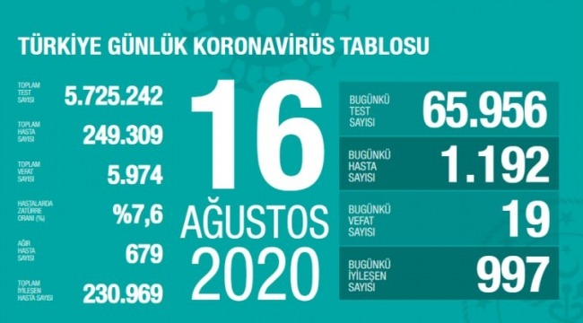 Tabloya göre, son 24 saatte 19 kişi korona virüsten hayatını kaybetti, toplam can kaybı ise 5 bin 974’e yükseldi. Bugün toplam 65 bin 956 test yapılırken, bin 192 yeni vaka tanısı konuldu. Toplam vaka sayısı 249 bin 309 oldu.