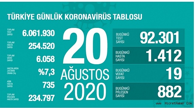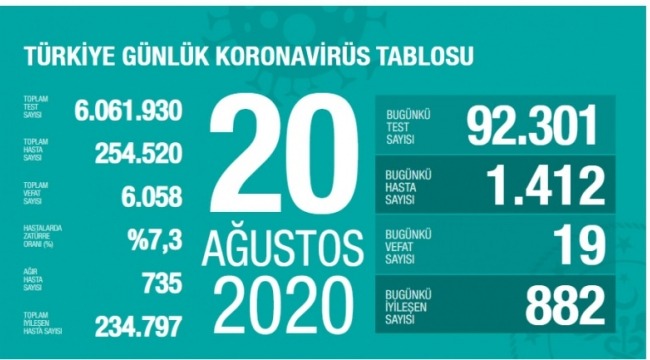 Sağlık Bakanlığı tarafından 20 Ağustos koronavirüs tablosu, vaka, test, vefat sayısı ve son durum açıklandı. Türkiye'de son 24 saatte 1412 kişiye Kovid-19 tanısı konuldu, 19 kişi hayatını kaybetti, toplam vaka sayısı 254 bin 520 bin, can kaybı 6 bin 58 oldu. Kritik verileri paylaşan Bakan Koca, önemli uyarılarda bulundu.