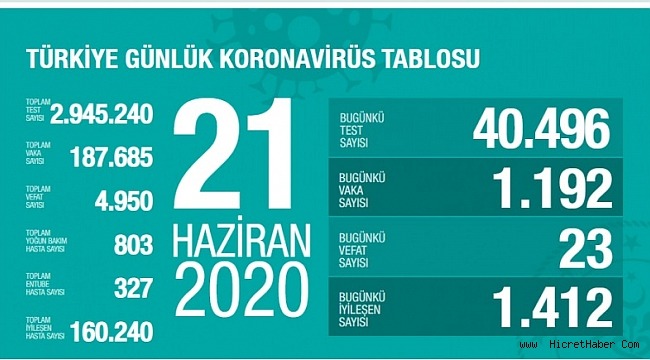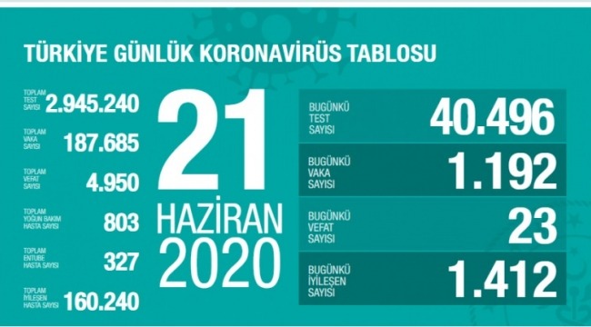 Sağlık Bakanlığı tarafından 21 Haziran koronavirüs tablosu, vaka, test, vefat sayısı ve son durum açıklandı. Türkiye'de son 24 saatte 1192 kişiye Kovid-19 tanısı konuldu, 23 kişi hayatını kaybetti, toplam vaka sayısı 187 bin 685, can kaybı 4 bin 950 oldu. Bakan Koca, son tabloya ilişkin değerlendirmesinde, 6 ilimizi örnek gösterdi.