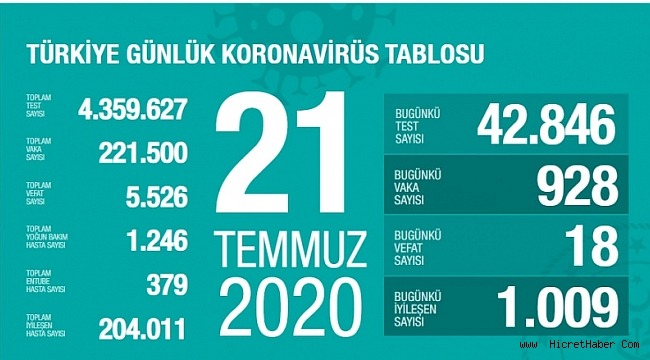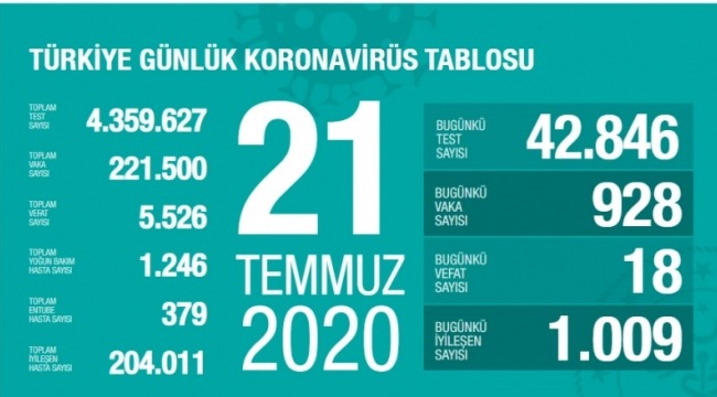 Sağlık Bakanlığından yapılan açıklamaya göre, son 24 saatte 18 kişi korona virüsten hayatını kaybetti, toplam can kaybı ise 5 bin 526'e yükseldi. Bugün toplam 42 bin 846 test yapılırken, 928 yeni vaka tanısı konuldu. Toplam vaka sayısı 221 bin 500 oldu.