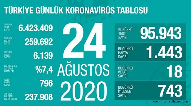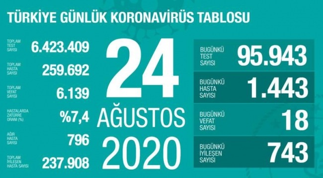 Sağlık Bakanı Fahrettin Koca 24 ağustos koronavirüs tablosuna ilişkin yaptığı açıklamada, ''Bugün yapılan yaklaşık 96 bin test sonucu 1.443 yeni hasta tespit edildi. Ağır hasta sayımız 800 civarında. Sağlık çalışanlarımız var gücüyle hastalarımızı iyileştirmeye çalışıyor. Hasta sayımızı düşürecek olan tedbirlerdir. Sonunda yenilen virüs olacak. '' ifadelerini kullandı.