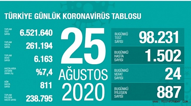 Bugün toplam 98 bin 231 test yapılırken, bin 502 yeni vaka tanısı konuldu. Toplam vaka sayısı 261 bin 194 oldu. Bugün iyileşen 887 kişiyle birlikte toplam iyileşen hasta sayısı da 238 bin 795’e yükseldi. Toplam hastalarda zatürre oranı yüzde 7,4, toplam ağır hasta sayısının ise 811 olduğu açıklandı.