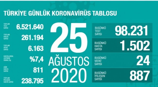 Sağlık Bakanı Fahrettin Koca, 25 Ağustos koronavirüs tablosuna ilişkin yaptığı açıklamada, ''Bugün toplamda 6.5 milyon test sayısını geçtik. Yeni tespit edilen 1.500’den fazla hastamız var. Yeni hasta sayısını düşürmek mücadelemizin en önemli hedefi. Bu hedefe katkı için tedbirlere uyum şart. Sonunda yenilen virüs olacak.'' ifadelerini kullandı.
