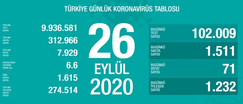 Sağlık Bakanı Fahrettin Koca 26 Eylül koronavirüs tablosuna ilişkin yaptığı açıklamada, ''Bugün tespit edilen 1.511 yeni hastamız var. Hasta sayısındaki düşüş işareti bizi tedbirlere daha sıkı tutunmaya davet ediyor. Ağır hasta sayımızda da artış hızı azalma eğiliminde. Birlikte mücadele tedbirlere birlikte uyarak mümkün.'' ifadelerini kullandı.