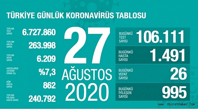 Bugün toplam 106 bin 111 test yapılırken, bin 491 yeni vaka tanısı konuldu. Toplam vaka sayısı 263 bin 998 oldu. Bugün iyileşen 995 kişiyle birlikte toplam iyileşen hasta sayısı da 240 bin 792’e yükseldi. Toplam hastalarda zatürre oranı yüzde 7,3, toplam ağır hasta sayısının ise 862 olduğu açıklandı.