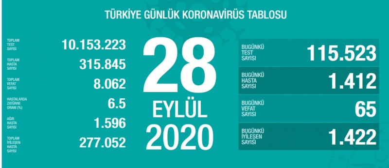 Sağlık Bakanlığı tarafından 28 Eylül koronavirüs tablosu, hasta, test, vefat sayısı ve son durum açıklandı. Türkiye'de son 24 saatte 115 bin 523 Kovid-19 testi yapıldı, 1412 kişiye hastalık tanısı konuldu. Son 24 saatte 1422 kişinin Kovid-19 tedavisinin tamamlanmasıyla, iyileşenlerin sayısı 277 bin 52'ye yükseldi. Bakan Koca, iyileşen hasta sayısının yeni vaka sayısından fazla olduğunu açıkladı.