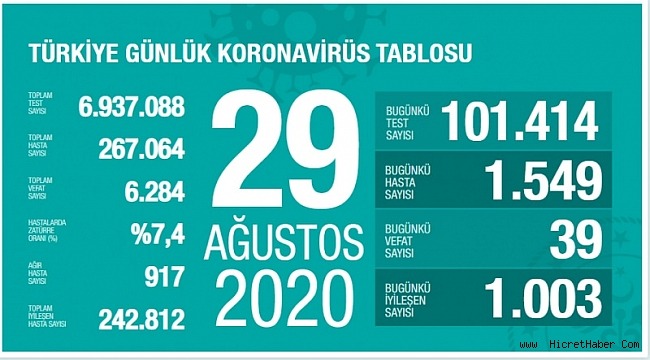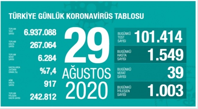 Sağlık Bakanlığı tarafından 29 Ağustos koronavirüs tablosu, vaka, test, vefat sayısı ve son durum açıklandı. Türkiye'de son 24 saatte 1549 kişiye Kovid-19 tanısı konuldu, 39 kişi hayatını kaybetti, toplam vaka sayısı 267 bin 64 , can kaybı 6 bin 284 oldu. Bakan Koca son tabloya ilişkin, ağır hatsa sayısının arttığını belirterek uyarılarda bulundu.