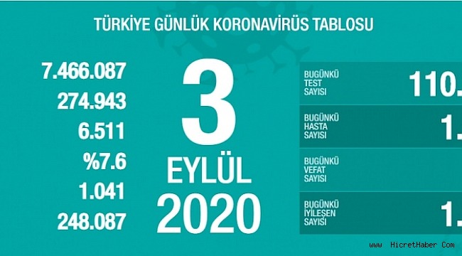 Bugün toplam 110 bin 225 test yapılırken, bin 642 yeni vaka tanısı konuldu. Toplam vaka sayısı 274 bin 943 oldu. Bugün iyileşen bin 211 kişiyle birlikte toplam iyileşen toplam hasta sayısı da 248 bin 87'e yükseldi. Toplam hastalarda zatürre oranının yüzde 7,6, toplam ağır hasta sayısının ise bin 41 olduğu açıklandı.