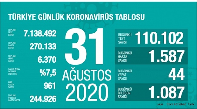Sağlık Bakanı Fahrettin Koca, 31 Ağustos koronavirüs tablosuan ilişkin yaptığı açıklamada, ''Bugün en yüksek günlük test sayısına ulaştık. 110.000’den fazla test yapıldı. 1.587 yeni hasta tespit edildi. Can kayıplarımızın üzüntüsünü sözcükler de rakamlar da ifade edemez. Gücümüz tedbir almaya ve sevdiklerimizi korumaya yeter. Güç tedbirde. '' ifadelerini kullandı.