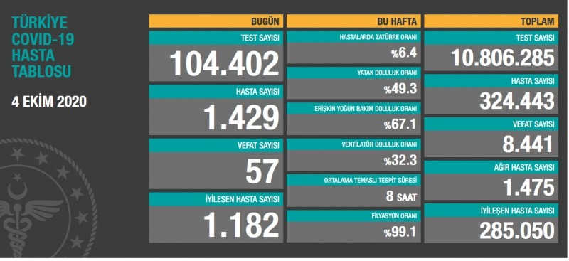 Sağlık Bakanı Fahrettin Koca, 4 Ekim koronavirüs tablosuna ilişkin yaptığı açıklamada, ''Bugün yapılan 104.402 test sonucunda 1.429 yeni hasta tespit edildi. Ağır hasta sayımız 1.475. Rehavete kapılmamalı ve tedbiri elden bırakmamalıyız. Birlikte tedbirlere uyarak virüse fırsat vermemeliyiz. Birlik olursak kazanan biz oluruz'' ifadelerini kullandı.
