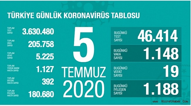 Sağlık Bakanı Fahretiin Koca 5 Temmuz koronavirüs tablosuna ilişkin, ''Son 3 günde, ortalama vaka sayısının en çok arttığı iller: İstanbul, Ankara, Gaziantep, Mardin, Konya, Bursa, Diyarbakır. Yoğun bakım hasta sayımız, yeni vakaları takiben, artış eğiliminde. TEDBİR VARKEN, “Bugün vefat eden sayısı” kanıksanacak tablo değil.'' ifadelerini kullandı.