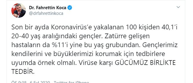 sosyal medya hesabından açıklamalarda bulunan Bakan Koca, ''Son bir ayda Koronavirüs’e yakalanan 100 kişiden 40,1’i 20-40 yaş aralığındaki gençler. Zatürre gelişen hastaların da %11’i yine bu yaş grubundan. Gençlerimiz kendilerini ve büyüklerimizi korumak için tedbirlere uyumda örnek olmalı. Virüse karşı GÜCÜMÜZ BİRLİKTE TEDBİR.'' uyarısında bulundu.