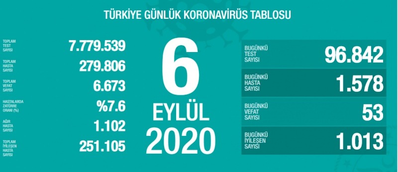 Buna göre, son 24 saatte 96 bin 842 kişiye korona virüs testi yapıldı, bin 578 kişiye virüs tanısı konuldu. 53 kişi hayatını kaybederken, bin 13 kişinin tedavisi tamamlandı.