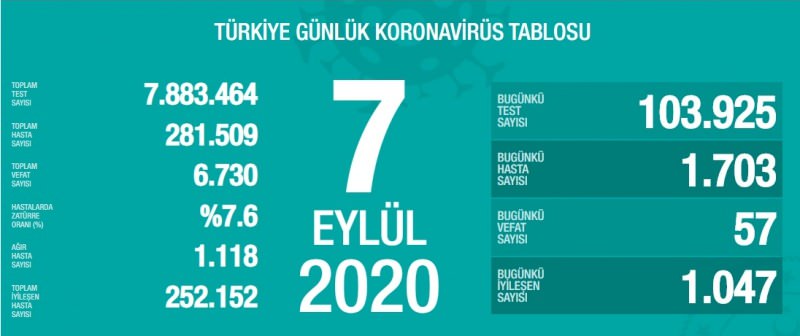 Bugün toplam 103 bin 925 test yapılırken, bin 703 yeni vaka tanısı konuldu. Toplam vaka sayısı 281 bin 509 oldu. Bugün iyileşen bin 47 kişiyle birlikte toplam iyileşen toplam hasta sayısı 252 bin 152'e yükseldi. Toplam hastalarda zatürre oranının yüzde 7,6, toplam ağır hasta sayısının ise bin 118 olduğu açıklandı.