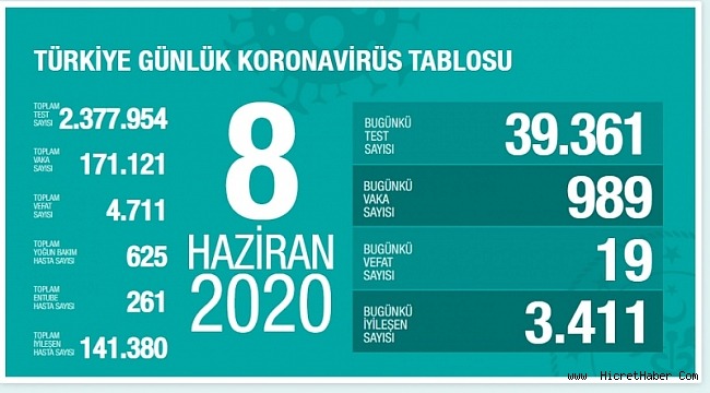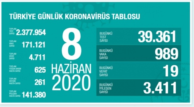 Sağlık Bakanı Fahrettin Koca, 8 Haziran koronavirüs tablosuna ilişkin yaptığı açıklamada, ''Vaka sayısında, maske ve mesafe kuralına uyulması şartıyla önü kesilmesi kolay bir hareketlilik var. İyileşen hasta sayımızda ciddi artış gerçekleşti. Solunum desteğine ihtiyaç azaldı. Yoğun bakım hasta sayısı yükselişte. TEDBİR AZALIRSA, TEHDİT ARTACAK.'' ifadelerini kullandı.