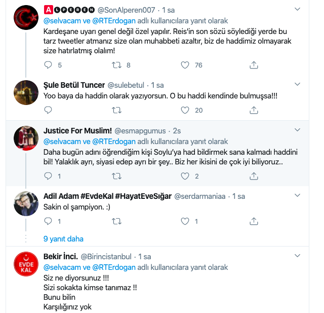 Erdoğan'ın fotoğrafını paylaşarak Süleyman Soylu'yu uyarıda bulunan AK Partili Selva Çam'ın paylaşımı şöyle:"Sn. Süleyman Soylu ’yu tabanımız sevmişti.
