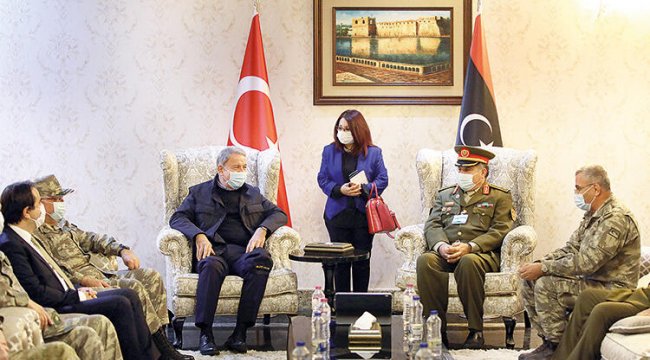 Daha sonra Tacura Polis Eğitim Merkezini ziyaret eden ve burada Libya İçişleri Bakanı Fethi Başağa ile bir araya gelen Akar, “Büyük işler başardınız, inşallah bunların tamamını getirip Libyalı kardeşlerimiz huzur, güven ve barış içinde yaşamayı sürdürecek” diye konuştu. İçişleri Bakanı Başağa da Akar ve komutanları ağırlamaktan memnuniyet duyduğunu dile getirdi. Hulusi Akar ve Yaşar Güler ve kuvvet komutanları ayrıca Libya Kara Harp Okulu’nun mezuniyet törenine katıldı. Libya’yı son olarak geçtiğimiz ağustos ayında ziyaret eden Akar, Türkiye’nin ‘Libya Libyalılarındır’ anlayışı çerçevesinde çalışmalarını sürdürdüğünü ifade etmiş, BM tarafından tanınan meşru hükümetle iş birliğinin devam edeceği mesajını vermişti.TÜRK ASKERİNİ TEHDİT ETMİŞTİLibya, 24 Aralık’ta bağımsızlığının 69’uncu yılını kutlamıştı. Bingazi merkezli Temsilciler Meclisi’nin törenine katılan gayrimeşru silahlı güçlerin komutanı Halife Hafter, Türk askerine yönelik tehdit açıklamalarında bulunmuştu. Hafter, “Tüm kuvvetlerimizi Libya’daki Türk kuvvetlerine karşı savaşa hazır olmaya çağırıyorum” demişti. Trablus merkezli hükümetin Savunma Bakanı Selahaddin Nemruş ise Hafter’in ülkeyi yeniden şiddet sarmalına sürüklemesine izin vermeyeceklerini ifade etmişti.