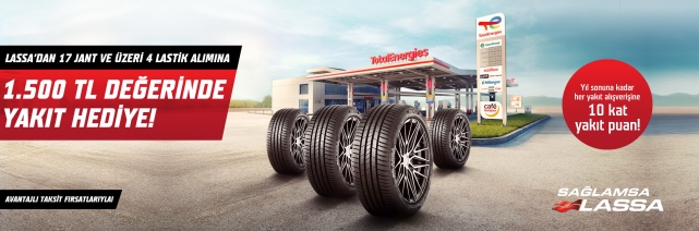LASSA markalı 17” jant ve üzeri 4 lastik alımında, TotalEnergies istasyonlarında geçerli 1.500 TL değerinde yakıt hediye!Kampanya 25 Mart – 31 Mayıs 2025 tarihleri arasında, Türkiye'deki yetkili Bridgestone, Lassa, Otopratik ve Lastik.com.tr satış noktalarından yapılacak Bridgestone & Lassa markalı tek seferde 17” jant ve üzeri 4 lastik alımında geçerli olacaktır.