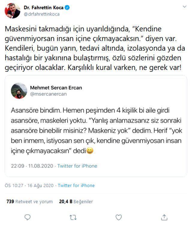 Bakan Koca, sosyal medya hesabından Kovid-19 tedbirleri kapsamında maske takılması uyarılarını dikkate almayanlara ilişkin paylaşımda bulundu.