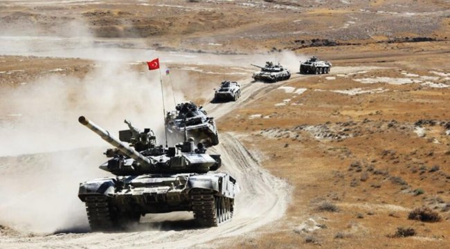 TÜRKİYE ile Azerbaycan arasındaki tatbikat 10 Ağustos’a kadar devam edecek. Tatbikatın dünkü senaryosuna göre, Nahçıvan Özerk Cumhuriyeti Silahlı Kuvvetleri ve Türk Silahlı Kuvvetleri (TSK) birlikleri verilen alarmla tam savaş durumuna geçerek araziye yayıldı. Ortak tatbikatta zırhlı mekanize birlikler ile kara ve kara havacı unsurları gövde gösterisi yaptı. Azerbaycan Ordusuna ait T-72 tankları ile tekerlekli zırhlı personel taşıyıcıları araziye yayılırken, öncü Azerbaycan zırhlı birliklerinde yer alan tanklarda Türk bayrakları dalgalandı.