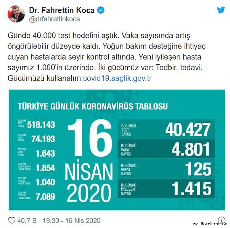 Sağlık Bakanı Fahrettin Koca da son duruma ilişkin sosyal medya üzerinden yaptığı açıklamada, "Günde 40.000 test hedefini aştık. Vaka sayısında artış öngörülebilir düzeyde kaldı. Yoğun bakım desteğine ihtiyaç duyan hastalarda seyir kontrol altında. Yeni iyileşen hasta sayımız 1.000'in üzerinde. İki gücümüz var: Tedbir, tedavi. Gücümüzü kullanalım." dedi.