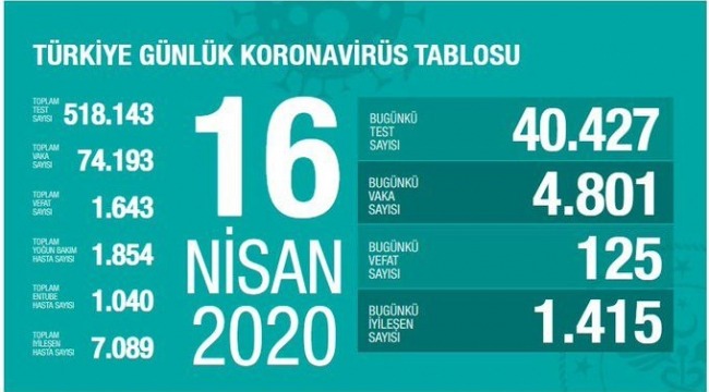 Toplam test sayısı 518 bin 143, toplam vaka sayısı 74 bin 193, toplam vefat sayısı 1643, toplam yoğun bakım hasta sayısı 1854, toplam entübe hasta sayısı 1040, toplam iyileşen hasta sayısı bin 7 bin 89 oldu.