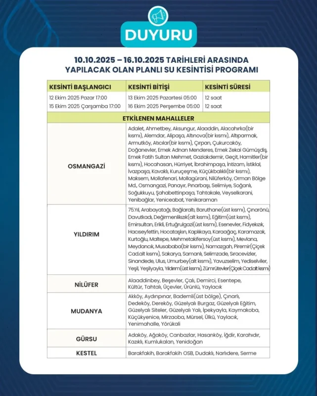 Bursalı vatandaşlar, kentte uzun süredir devam eden altyapı sorunları ve su kesintilerinin çözülmemesinden şikâyetçi.Birçok kişi sosyal medyada, “Hizmet yok, çözüm yok ama Filistin’e destek veren afişler sökülüyor” diyerek belediyenin önceliklerini eleştirdi. Vatandaşlar, belediyenin kriz yönetimi konusundaki eksikliklerine dikkat çekerek şu ifadeleri kullandı: “Kuraklık her yıl yaşanıyor ama bir türlü önlem alınmıyor. Yeni baraj projeleri, su tasarruf sistemleri ya da altyapı yenilemeleri hâlâ yok. Şimdi yine bedelini biz ödüyoruz.”