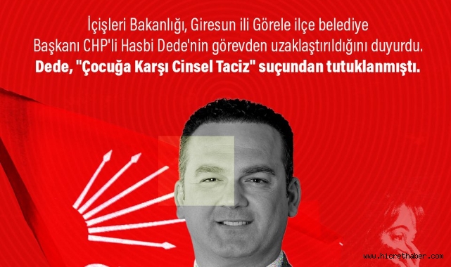 Açıklamada, Hasbi Dede’nin Görele Cumhuriyet Başsavcılığı’nca “Çocuğa Karşı Cinsel Taciz” suçundan yürütülen soruşturma kapsamında 10 Şubat 2026 tarihinde mahkemeye sevk edildiği ve Görele 1. Asliye Ceza Mahkemesi’nin kararıyla tutuklandığı belirtilerek, Anayasa’nın 127’nci maddesi ile 5393 sayılı Belediye Kanunu’nun 47’nci maddesi uyarınca geçici bir tedbir olarak görevden uzaklaştırıldığı ifade edildi.