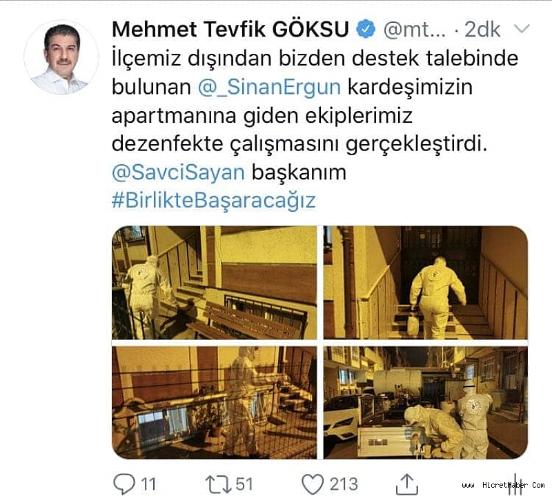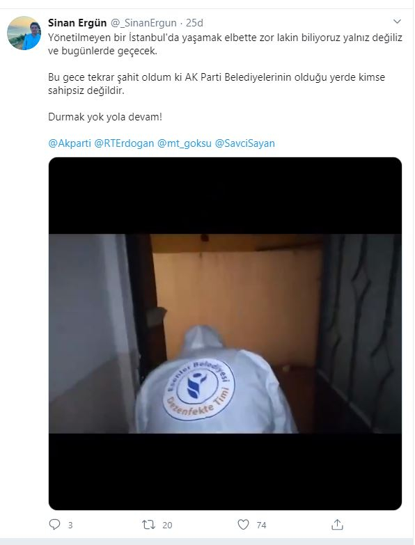 Son olarak binaya gelen belediye görevlilerini ve dezenfekte çalışmalarını paylaşan vatandaş, ''Yönetilmeyen bir İstanbul'da yaşamak elbette zor lakin biliyoruz yalnız değiliz ve bugünlerde geçecek. Bu gece tekrar şahit oldum ki AK Parti Belediyelerinin olduğu yerde kimse sahipsiz değildir. Durmak yok yola devam!'' ifadelerini kullandı.