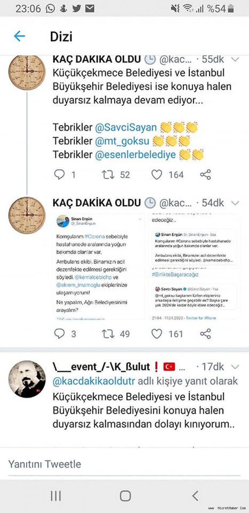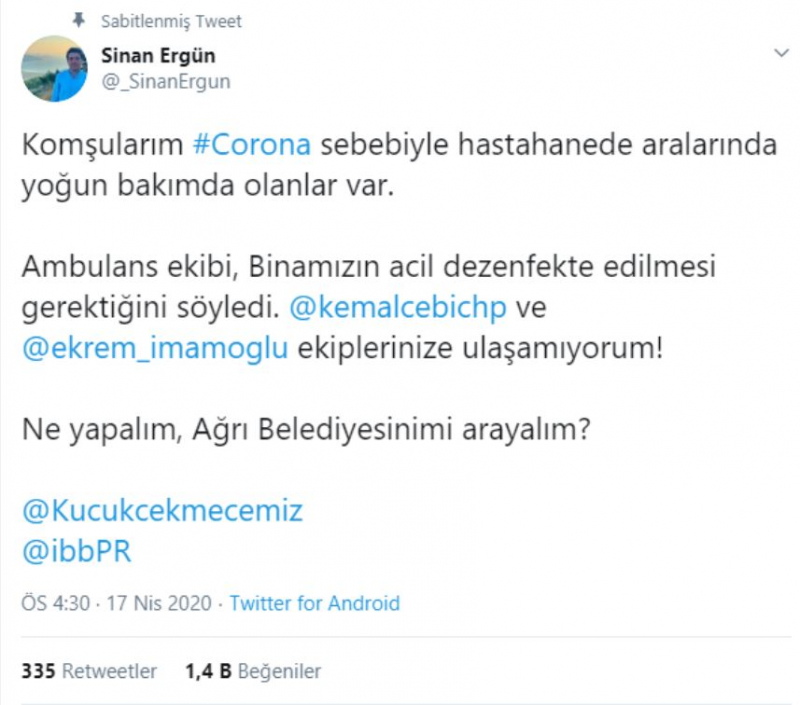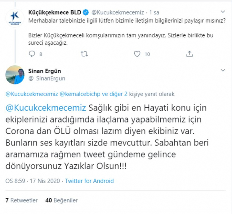 Vatandaş sosyal medya hesabından yaptığı paylaşımda Küçükçekmece Belediyesi ekiplerine ulaşamadığını söyleyerek, “Komşularım korona sebebiyle hastanede. Aralarında yoğun bakımda olanlar var. Ambulans ekibi, binamızın acil dezenfekte edilmesi gerektiğini söyledi. Ekiplerinize ulaşamıyorum. Ne yapalım, Ağrı Belediyesini mi arayalım?” ifadelerine yer verdi.