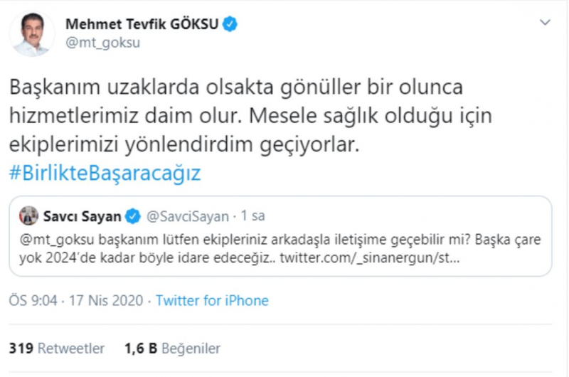 İroni yaparak Ağrı Belediyesi’ni etiketledikten sonra Ağrı Belediye Başkanı Savcı Sayan konuyla ilgili olarak yaptığı paylaşımda Esenler Belediye Başkanı Mehmet Tevfik Göksu’yu etiketleyerek, “Başkanım lütfen ekipleriniz arkadaşla iletişime geçebilir mi? Başka çare yok 2024’de kadar böyle idare edeceğiz” ifadelerini kullandı.