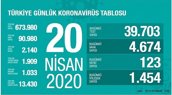 Sağlık Bakanı Fahrettin Koca, Twitter'dan koronavirüste yeni vaka sayısını açıkladı. Bakan Koca'nın açıkladığı son verilere göre, bugün 39.703 kişiye koronavirüs testi yapıldı ve 4.674 yeni vaka tespit edildi. Son 24 saatte 123 kişi hayatını kaybederken 1.454 kişi sağlığına kavuştu.
