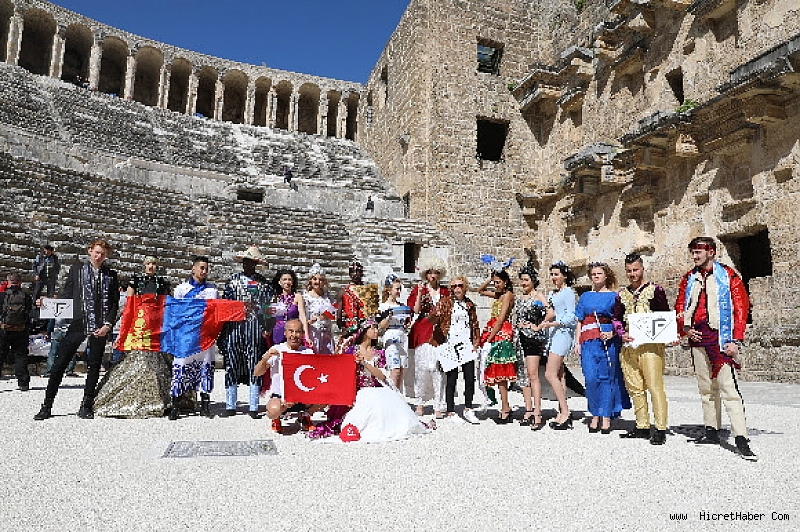 70 yaşındaki Türkiye Triatlon Şampiyonu Milli Sporcu, ANFAŞ Yönetim Kurulu Başkanı Ali Bıdı ile birlikte Aspendos Antik kentini ülkelerinin rengarenk ve birbirinden ilginç kıyafetleri ile gezen modeller, Antalya’dan dünyaya dostluk ve barış mesajı verdiler, bol bol fotoğraf çektirdiler.