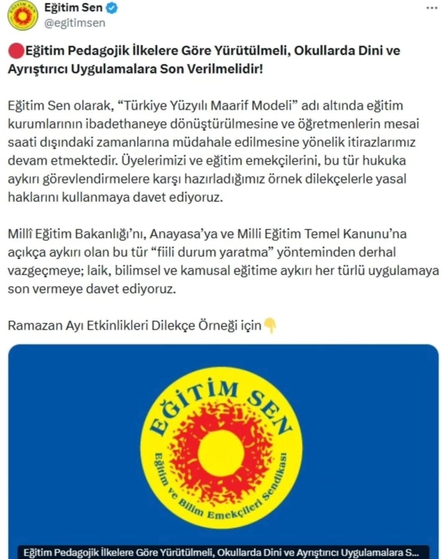 Ramazan ayı öncesinde Milli Eğitim Bakanlığı’nın okullara gönderdiği etkinlik yazısı üzerinden başlayan tartışmalar kamuoyunda geniş yankı uyandırdı. Bazı sendika ve eğitim çevrelerinin Ramazan kapsamında planlanan etkinliklere karşı çıkmasına, Eğitim-Bir-Sen İstanbul 5 No’lu Şube Başkanı Yusuf Sabaz’dan sert açıklama geldi. Sabaz, yapılan eleştirilerin pedagojik hassasiyet değil, ideolojik bir yaklaşım taşıdığını savundu.