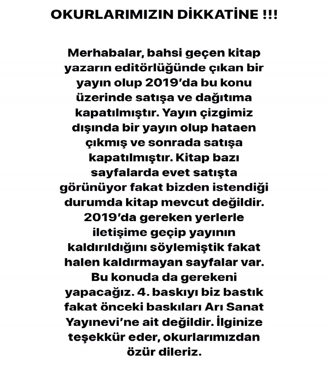 ARI SANAT YAYINEVİ'NDEN İLGİNÇ AÇIKLAMA