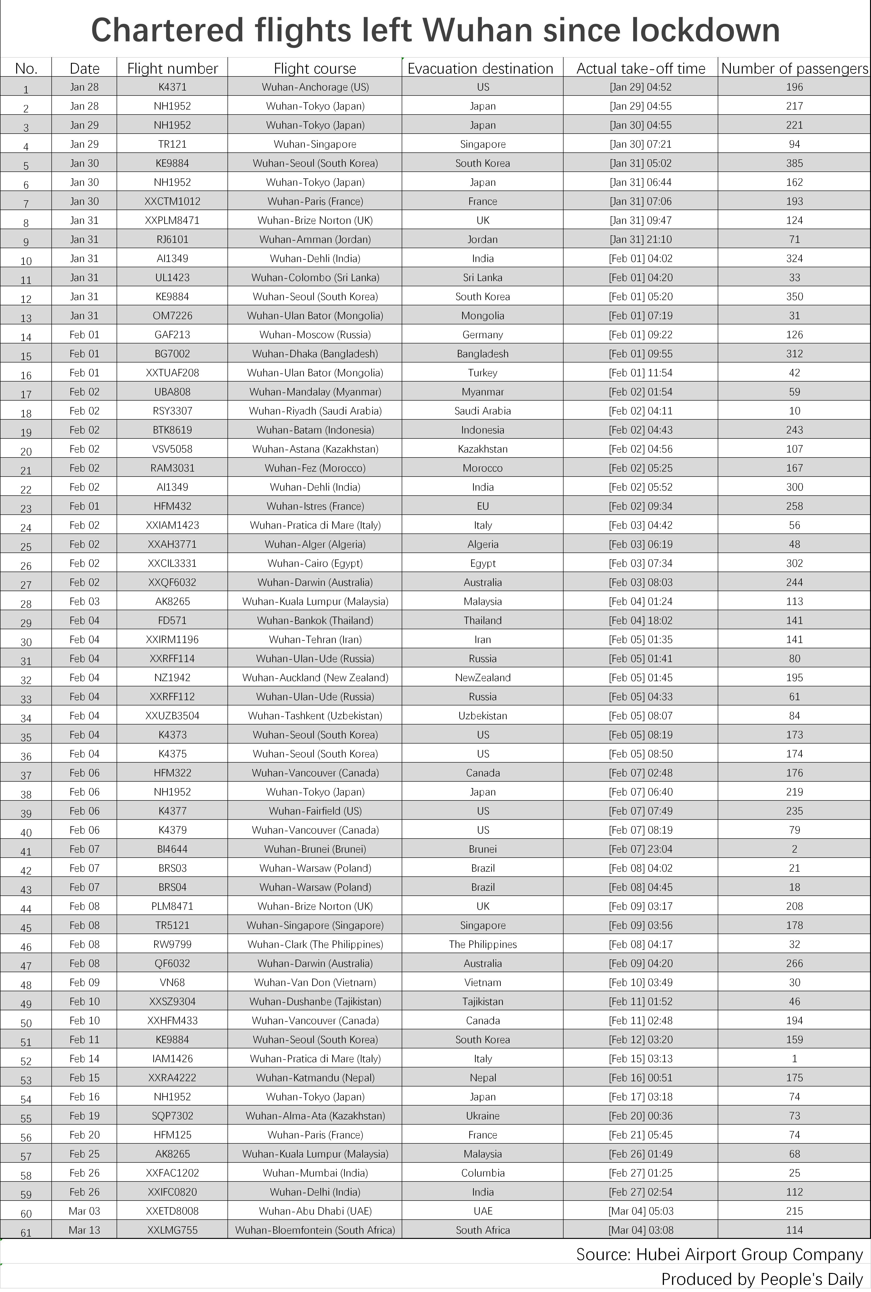Çin’de yaşayan 35 ülkeden 8.631 yabancının karantinadan itibaren ülkelerine gönderilmesini sağlayan özel uçuş seferleri için dahi Wuhan, uçuşlara ancak ilgili ülkelerin başvurusu ve Çin tarafının onayı üzerine izin vermiştir. Söz konusu yabancılar, esas itibariyle Hubei’deki elçilik ve konsolosluk personeli ve yabancı öğrencilerdir.