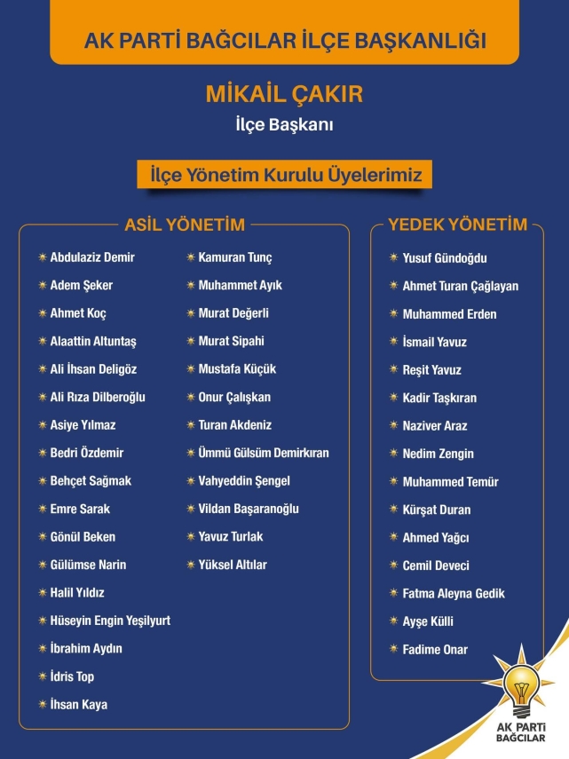 Yeni dönemin birlik, beraberlik ve kararlılık ruhuyla şekillendiğini vurgulayan Çakır, “Liderimiz Sayın Recep Tayyip Erdoğan’ın izinde, Türkiye Yüzyılı vizyonu ile Bağcılar’ımıza hizmet edecek yeni ilçe yönetimimizi kamuoyuna saygıyla sunuyorum. Bayrağı devralan tüm dava arkadaşlarımıza muvaffakiyetler diliyorum” ifadelerini kullandı.