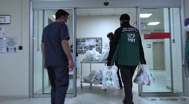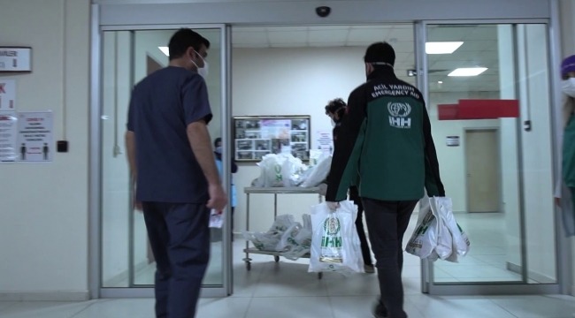 Sağlıkçılara moral ziyareti Vakıf, yurt içinde sadece yardım dağıtmadı, sağlık çalışanlarının moral ve motivasyonu için de faaliyet yürüttü. Ekipler, hastane hastane dolaşarak sağlık personellerine teşekkür maksadıyla küçük hediye paketleri teslim etti. Gece gündüz vatandaşlarımız için çalışan sağlıkçılara İHH; meyve suyu, kek, el dezenfektanı, terlik, pijama, tıbbi cihazlar için pil, maske ve eldiven ulaştırdı.
