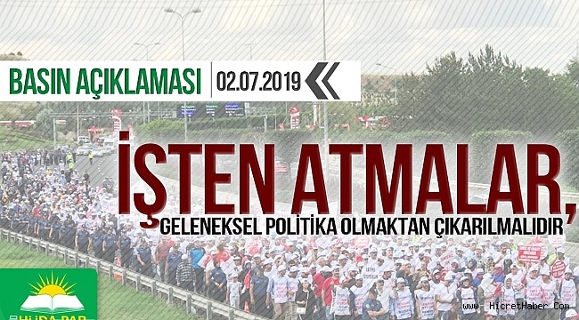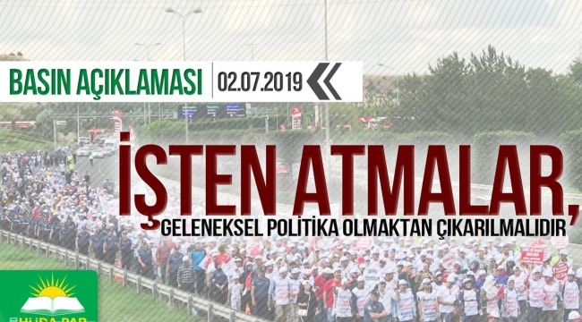 HÜDA PAR Sosyal İşler Başkanlığı, bazı belediyelerin el değiştirmesi ile birlikte toplu işten çıkarmaların yaşandığına dikkat çekerek, “Siyasal ve düşünsel farklılıklar maalesef insanların ekmeğiyle oynamayı maharet sayacak bir kültür üretmiştir.” denildi.