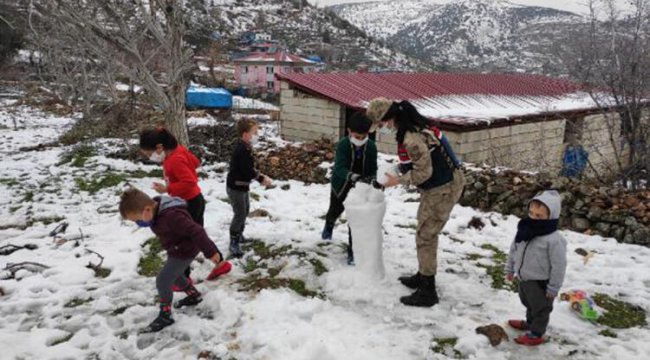 KAHRAMANMARAŞ'ın Türkoğlu ilçesinde jandarma ekipleri karda oynayan çocuklarla önce oyuncak hediye etti, ardından da onlarla birlikte kardan adam yaptı.