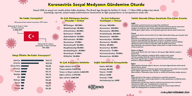 Sosyal CRM ve sosyal veri analizi şirketi Adba Analytics, The Brand Age Dergisi ile birlikte 21 Ocak – 11 Mart 2020 aralığını baz alarak hazırladığı raporda, sosyal medya kullanıcılarının koronavirüs ile ilgili paylaşımlarını ve konuşmalarını analiz etti. Çin’in Wuhan kentinde ilk vakanın görülmesiyle hızla yayılan koronavirüs, ölü sayısının artışıyla insanları paniğe sürükledi. Sosyal medya kullanıcıları salgın ile ilgili güncel gelişmeleri ve vaka sayısını Dünya Sağlık Örgütü (WHO) başta olmak üzere çeşitli kuruluşların resmi hesaplarından takip etti. Dünya’yı adeta paniğe sürükleyen salgın ile ilgili sosyal CRM ve veri analizi şirketi Adba Analytics, The Brand Age dergisi ile birlikte Twitter, YouTube, forum siteleri, bloglar ve haber sitelerindeki paylaşımları; Türkçe, İngilizce, Almanca, Japonca, Rusça, Portekizce, İtalyanca, Fransızca, İspanyolca, Çince, Arapça ve Farsça dillerinde yapılan paylaşımları da kapsayarak analiz etti.Koronavirüsü hakkında sosyal medya kullanıcılarının dünya genelinde yaptığı paylaşımlar 275 milyonun üzerine çıkmıştır. En çok paylaşım adedi sırasıyla Japonya, ABD ve Güney Kore lokasyonlarından yapılmıştır. En Çok Paylaşım Yapan Ülkeler:Japonya: %23,13Amerika: %22,53Güney Kore: %3,52Britanya: %3,33Fransa: %3,15Brezilya: %3,10Çin: %2,97Malezya: %2,60Tayvan: %2,34İtalya: %2,31Türkiye: %2,20 Paylaşım Adetleri:Japonya: 41.272.779Amerika: 37.932.712Çin: 5.581.751İtalya: 3.597.707 Dünya genelinde toplam paylaşım: 275 milyonTürkiye’de21 Ocak-11 Mart tarihleri arasında: 6.506.597Türkiye’de ilk vakanın açıklandığı 11 Mart tarihinde: 747.862 Global paylaşımlarda öne çıkan konular