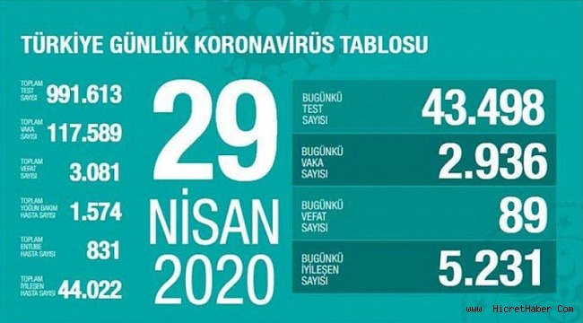 Sağlık Bakanı Fahrettin Koca, Twitter hesabından paylaştığı tablo ile birlikte "Test sayısındaki artışa kıyasla vaka sayısındaki artış öngörülebilir düzeyde. İyileşen hastalarımızın sayısı 44.000'i, toplam vaka sayımızın da üçte birini geçti. Yoğun bakıma ihtiyaç duyan hasta sayımız azalmaya devam ediyor. Tedbirde ısrarcı olalım. " açıklamasında bulundu.