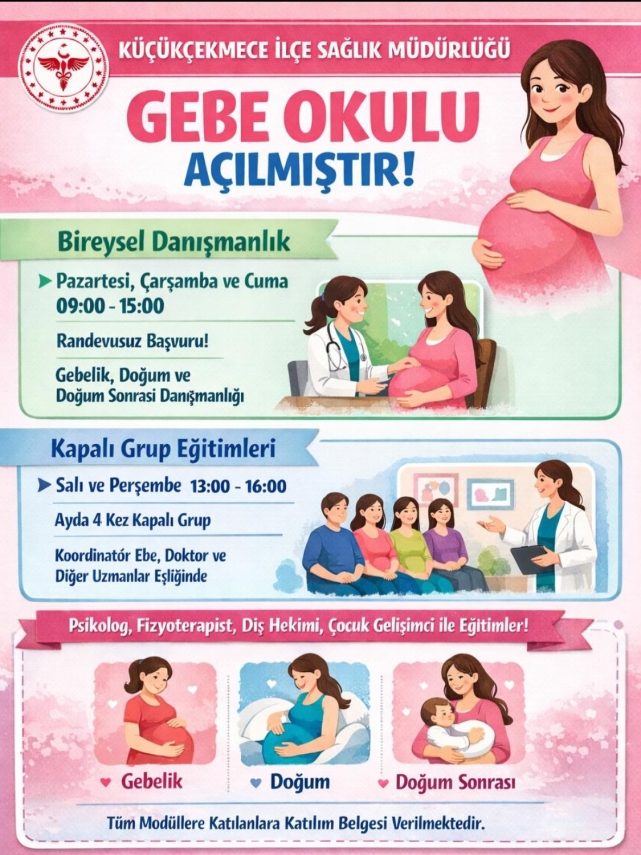 Küçükçekmece Kaymakamlığı koordinasyonunda İlçe Sağlık Müdürlüğü bünyesinde hizmet veren Gebe Okulu, anne adaylarına gebelik süreci, doğuma hazırlık ve bebek bakımı konularında ücretsiz eğitim ve danışmanlık desteği sunarak sağlıklı bir gebelik dönemi geçirmelerine katkı sağlıyor.