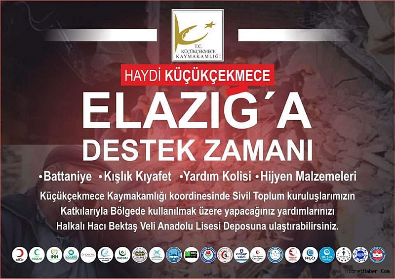Küçükçekmece Kaymakamı Turan Bedirhanoğlu önderliğinde Küçükçekmece de bulunan 20’den fazla sivil toplum kuruluşu Elazığ depreminde zor durumda kalan vatandaşlarımıza yardım elini uzatmak için ortak hareket ederek yardım toplandı.