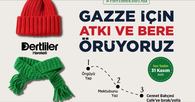 Gazze’de savaşın yıktığı sokaklarda çocuklar, soğuğun ve yoksulluğun acımasız yüzüyle mücadele ederken; Türkiye’den yüreği merhametle dolu eller, onların yüreğine sıcaklık taşıyor. Dertliler Hareketi Eğitim, Kültür ve Yardımlaşma Derneği, “Gazzeli Çocuklar Üşümesin” temasıyla anlamlı bir kampanyaya imza attı. “Gazze İçin Atkı ve Bere Örüyoruz” adıyla başlatılan proje kapsamında, kadınlar ve çocuklar el emeğiyle atkı, bere, eldiven, kazak ve mont örerek Gazze’deki kardeşlerine destek oluyor. Kampanyanın en dikkat çeken yönü ise, hiçbir maddi bağışın kabul edilmemesi; tamamen gönüllülük, üretim ve dayanışma esasına dayanması.